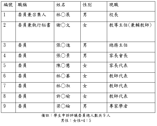 114學年度學生申訴評議委員會委員名單